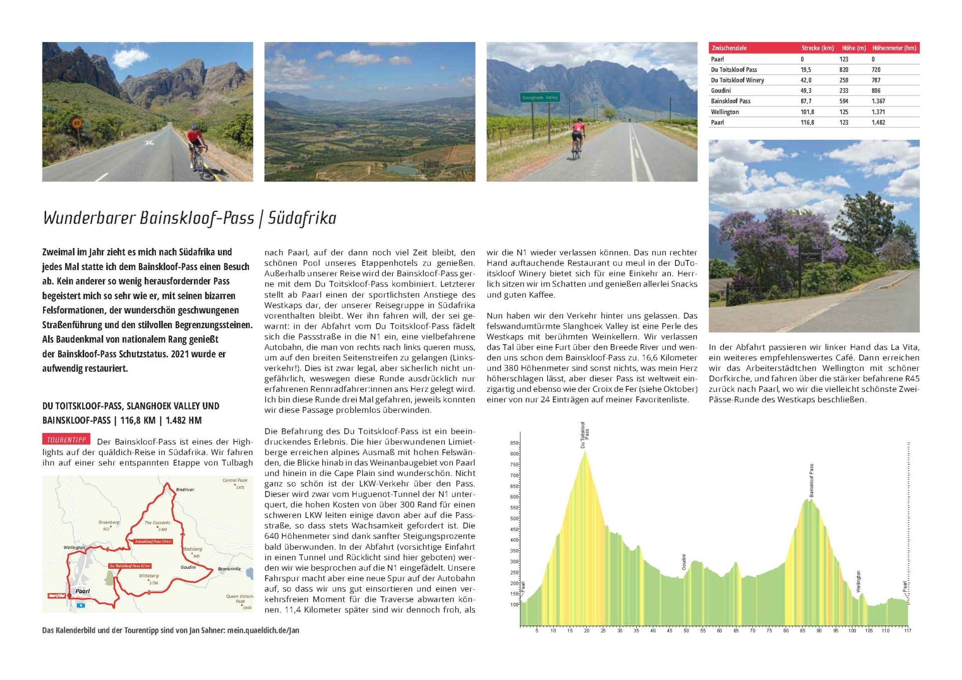 Im Format A3 finden sich auf 12 Monatsblättern und dem Titelblatt 13 herausragende Bilder. Panoramen, Auf- und Abfahrten, Frühling, Sommer, Herbst und Winter - der Kalender zeigt das Radfahren von der schönsten Seite. Die Monatsblätter enthalten neben dem Bild ein übersichtliches Kalendarium (inkl Feiertagen). Jedes Kalenderbild wird auf der Rückseite mit einem kurzen emotionalen Text aus Sicht des Bildautors beschrieben und mit einem ausführlichen Tourentipp inklusive Beschreibung, Bildern, Höhenprofil und Übersichtskarte ergänzt.